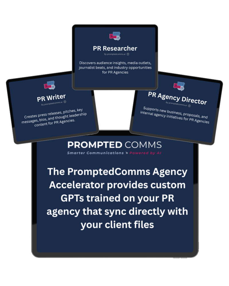The PromptedComms Agency Accelerator equips your firm with a suite of private, secure custom GPTs that integrate directly into your workflow — purpose-built for PR professionals and tailored to your agency’s clients, tone, and process.